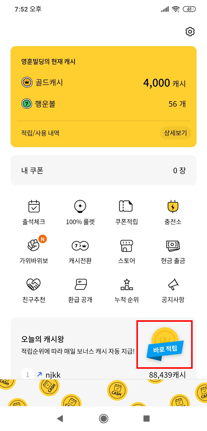 오늘의 캐시는 매일 매일 캐시를 적립할 수 있는 어플 입니다.